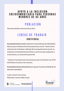 El programa de apoyo a la inclusión sociocomunitaria para personas menores de 65 años del Departamento de Servicios Sociales del Distrito San Blas-Canillejas comprende acciones dirigidas a la potenciación de la inclusión social de aquellas personas que se encuentran en riesgo o vulnerabilidad.